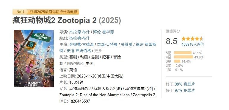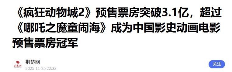 信源来源:荆楚网 2025.11.25 《疯狂动物城2》预售票房突破3.1亿,超过《哪吒之魔童闹海》成为中国影史动画电影预售票房冠军