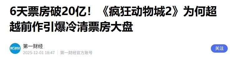 第一财经 2025.12.1 6天票房破20亿!《疯狂动物城2》为何超越前作引爆冷清票房大盘